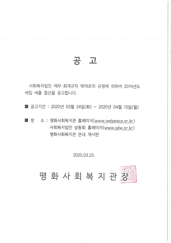 2019년 평화사회복지관 세입, 세출 결산서 공고 게시 페이지 정보 작성자 평화사회복지관 댓글 0건 조회 3,554회 작성일 20-03-24 02:03 본문 사회복지법인 재무 회계규칙 제 19조 규정에 의하여 2019년도 세입, 세출 결산서를 공고 게시 합니다. 페이스북 공유 트위터 공유 구글+ 공유 목록 이전글2020년 평화사회복지관 1차 추경예산서 공고 게시 20.03.24 다음글2021년 시니어트레이너 양성과정 시즌2 참여자 모집 21.01.04 댓글목록 댓글목록 등록된 댓글이 없습니다.