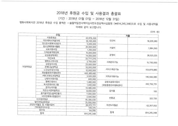 2018년 평화사회복지관 후원금 공고문& 수입지출내역