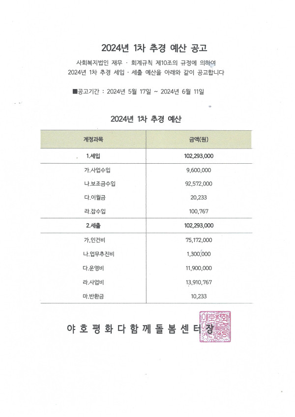 야호 평화다함께돌봄센터 2024년 1차 추경 예산 게시 공고