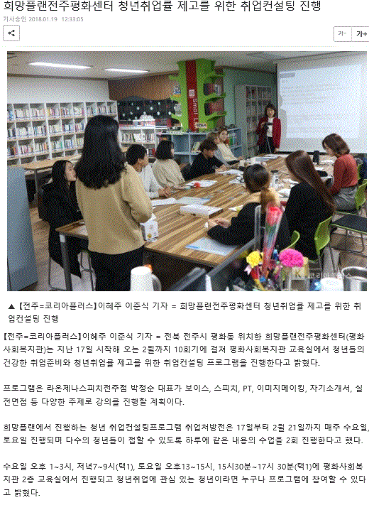 희망플랜전주평화센터 청년 취업률 제고를 위한 직업컨설팅 진행 페이지 정보 작성자 평화사회복지관 댓글 0건 조회 2,899회 작성일 18-01-19 01:01 본문 목록 이전글2018년 평화꿈틀 작은도서관 프로그램 홍보 안내 18.02.28 다음글희망플랜 청소년 자존감향상프로그램 실시 18.01.16 댓글목록 댓글목록 등록된 댓글이 없습니다.