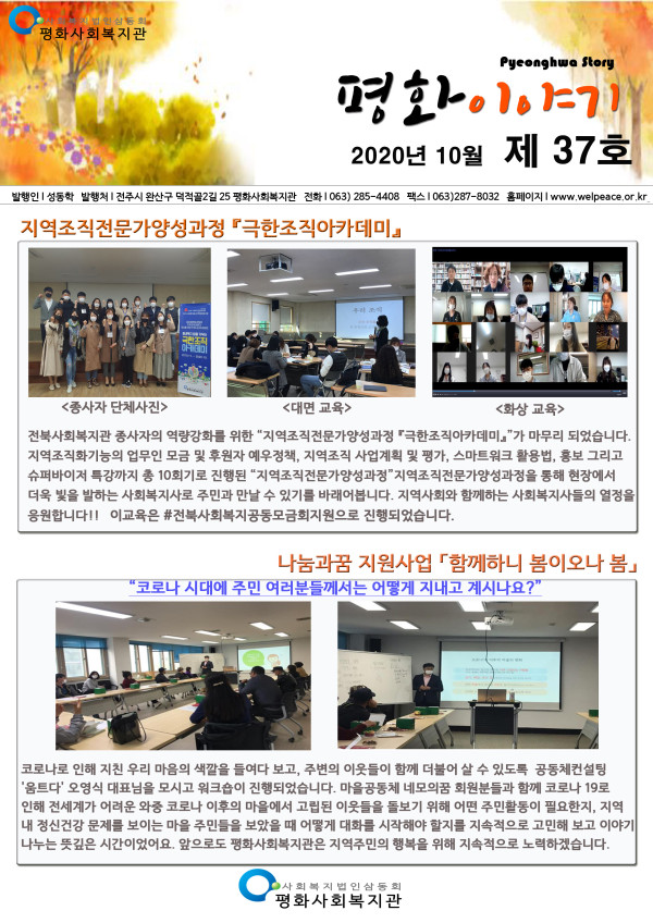 2020년 평화사회복지관 10월 소식지 페이지 정보 작성자 평화사회복지관 댓글 0건 조회 2,280회 작성일 20-11-30 05:11 본문 10 목록 이전글2020년 평화사회복지관 11월 소식지 20.11.30 다음글평화사회복지관 2월 소식지 19.03.04 댓글목록 댓글목록 등록된 댓글이 없습니다.