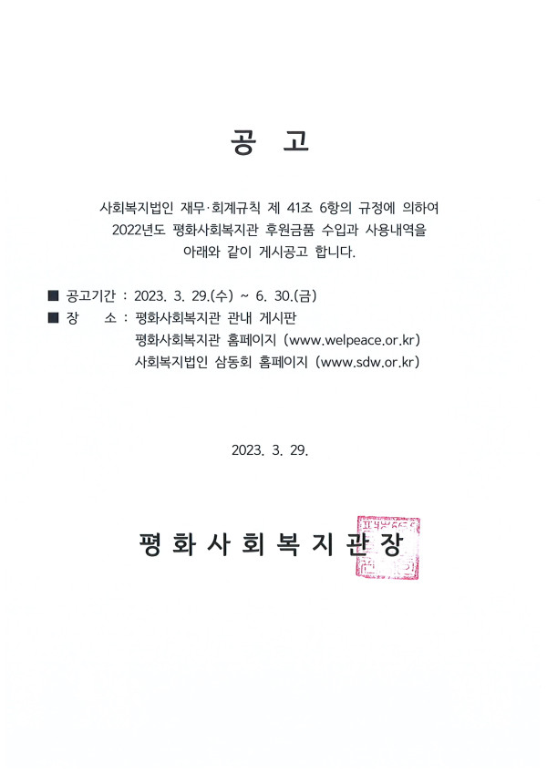 평화사회복지관 2022년 후원금품 사용내역 결과 게시 공고 페이지 정보 작성자 관리자 댓글 0건 조회 1,374회 작성일 23-03-29 11:45 본문 페이스북 공유 트위터 공유 구글+ 공유 첨부파일 2022년 후원금 수입 및 사용결과보고서평화사회복지관.xls (817.5K) 65회 다운로드 | DATE : 2023-05-04 16:49:12 목록 이전글평화사회복지관 2023년 1차 추경 예산서 게시 공고 23.03.29 다음글평화사회복지관 2022년 세입·세출 결산서 게시 공고 23.03.29 댓글목록 댓글목록 등록된 댓글이 없습니다.