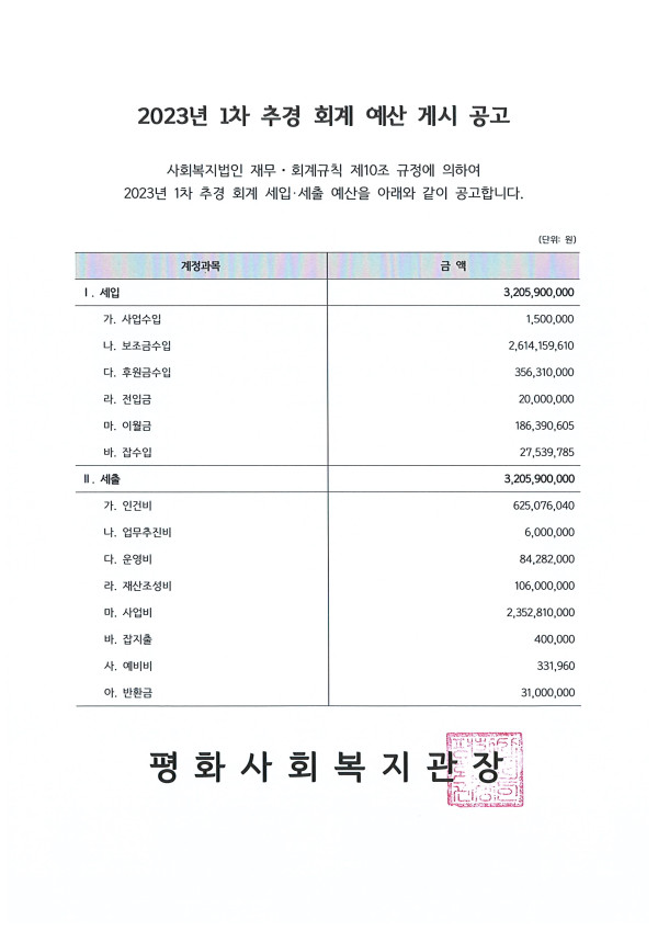 평화사회복지관 2023년 1차 추경 예산서 게시 공고 페이지 정보 작성자 관리자 댓글 0건 조회 1,506회 작성일 23-03-29 11:46 본문 페이스북 공유 트위터 공유 구글+ 공유 목록 이전글액티브시니어 운동지도 실무트레이닝 『참여자 모집』 23.04.18 다음글평화사회복지관 2022년 후원금품 사용내역 결과 게시 공고 23.03.29 댓글목록 댓글목록 등록된 댓글이 없습니다.