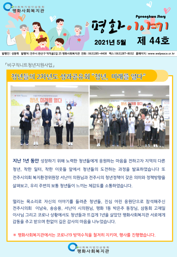 2021년 평화사회복지관 5월 소식지 페이지 정보 작성자 관리자 댓글 0건 조회 1,764회 작성일 21-06-01 09:12 본문 관련링크 https://www.facebook.com/welpeace/posts/1166962727063516 1249회 연결 http://pf.kakao.com/_Dxoxgxcxl/79703608 927회 연결 목록 이전글2021년 평화사회복지관 6월 소식지 21.07.01 다음글2021년 평화사회복지관 4월 소식지 21.05.01 댓글목록 댓글목록 등록된 댓글이 없습니다.