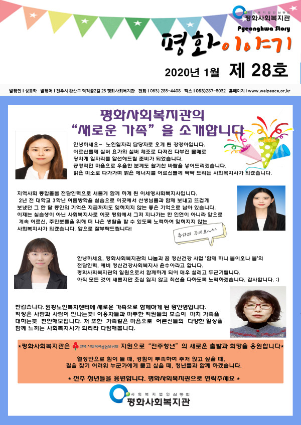 2020년 평화사회복지관 1월 소식지 페이지 정보 작성자 평화사회복지관 댓글 0건 조회 2,478회 작성일 20-02-04 03:02 본문 목록 이전글평화사회복지관 6월 소식지 18.06.29 다음글평화사회복지관 9월 소식지 18.10.01 댓글목록 댓글목록 등록된 댓글이 없습니다.