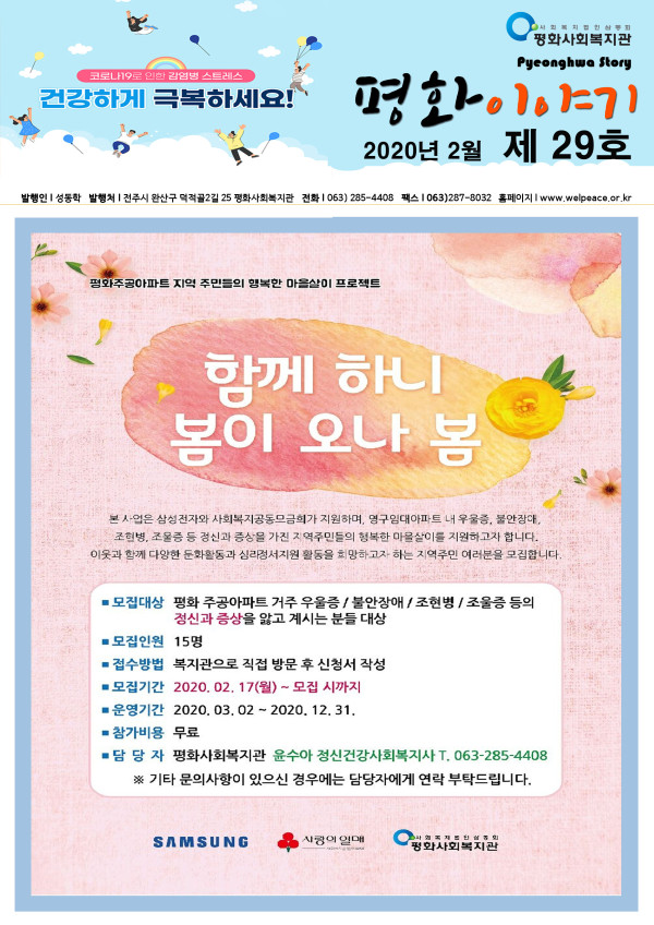 2020년 평화사회복지관 2월 소식지 페이지 정보 작성자 평화사회복지관 댓글 0건 조회 2,016회 작성일 20-03-02 08:03 본문 목록 이전글평화사회복지관 6월 소식지 19.07.01 다음글평화사회복지관 7월 소식지 19.07.31 댓글목록 댓글목록 등록된 댓글이 없습니다.